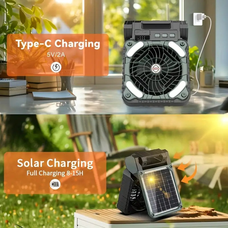 Type‑C fast charging (5V 2A) or full solar charge in 8–15 hours.